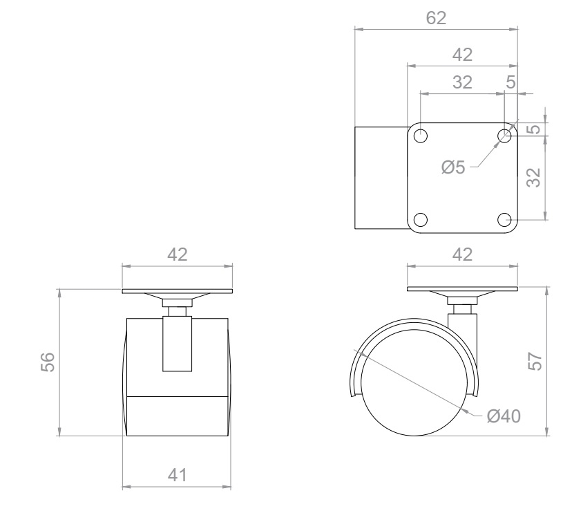 Kółko skrętne Φ 40mm bez hamulca, montaż na płytce 42x42mm.
